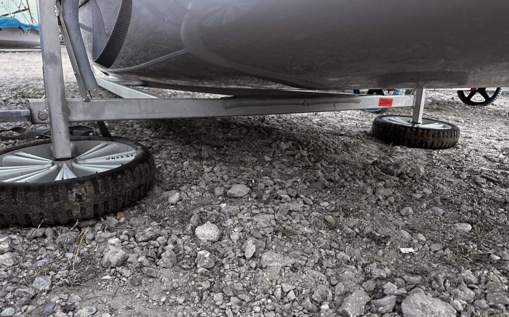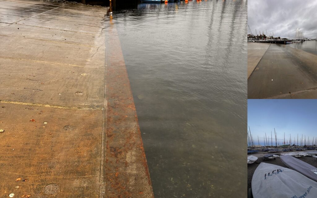 Abends haben wir dann noch unsere Boote gesichert, also die Räder abgemacht, damit sie in dem kommenden Wind nicht davon Segeln. Wie angesagt gab es dann Samstag eine Grundwindstärke von 20 kn und in Böen bis zu 45 kn. Weshalb die Wettfahrtleitung sich nicht dazu entschlossen hat rauszufahren , denn außer dem Wind gab es noch ein anderes Problem. Die Hauptslipprampe hatte so wenig Wasser das es sehr schwierig war die Boote bei diesem Wind ins Wasser zu kriegen. Also gab es am Samstag keine Rennen.